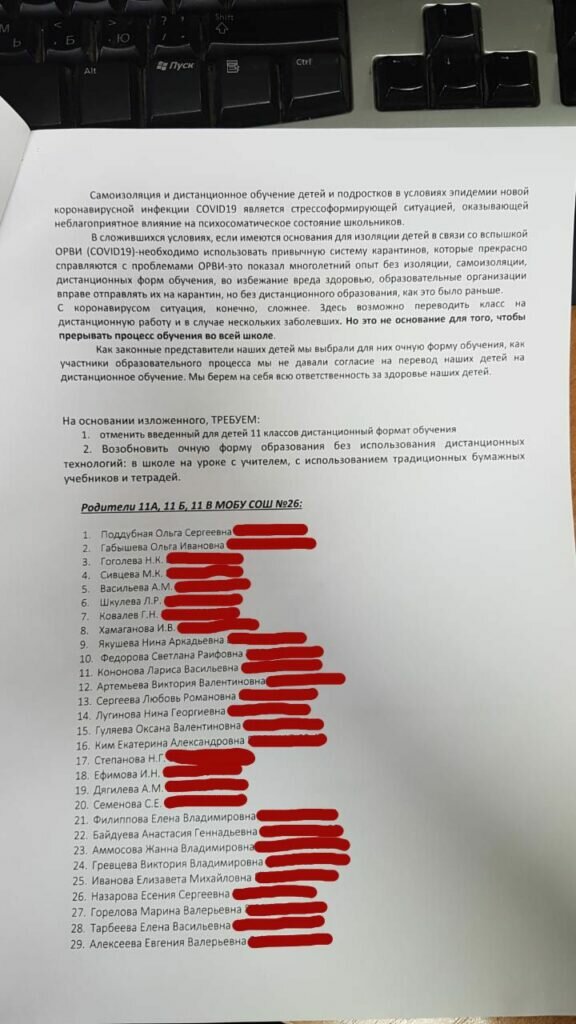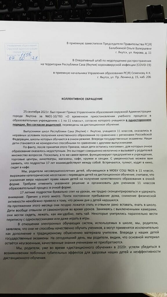 Коллективное обращение родителей было отправлено по трем адресам: зампреду правительства Ольге Балабкиной, в оперштаб по недопущению распространения на территории Якутии короновирусной инфекции и в начальнику Управления образования г. Якутска.