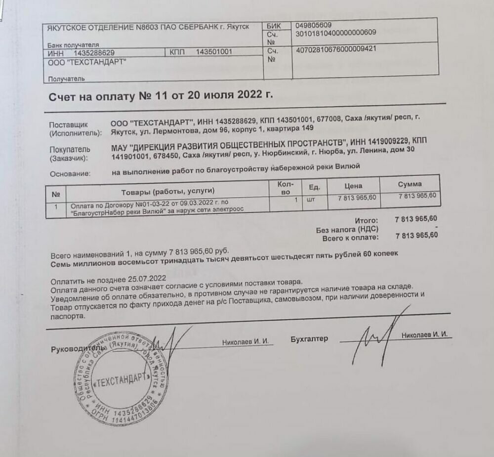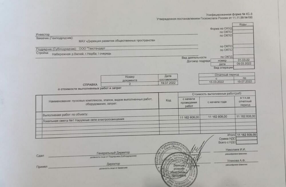 Теперь же стало известно, что 19 июля был подписан Акт о приемке выполненных работ между МАУ «Дирекция развития общественных пространств» (Администрация г. Нюрба) и ООО «Техстандарт». Сумма акта — 11,1 млн рублей.