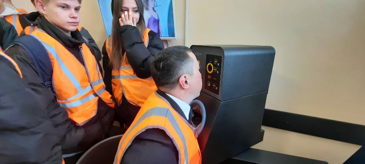 Кроме того, школьники узнали, как проводится ежедневный автоматизированный медицинский осмотр с помощью «умного» кресла с датчиками, которые фиксируют любое недомогание, будь то сбой сердечных ритмов или изменение давления. Даже небольшое наличие алкоголя в крови является серьёзным показателем для отстранения от работы.