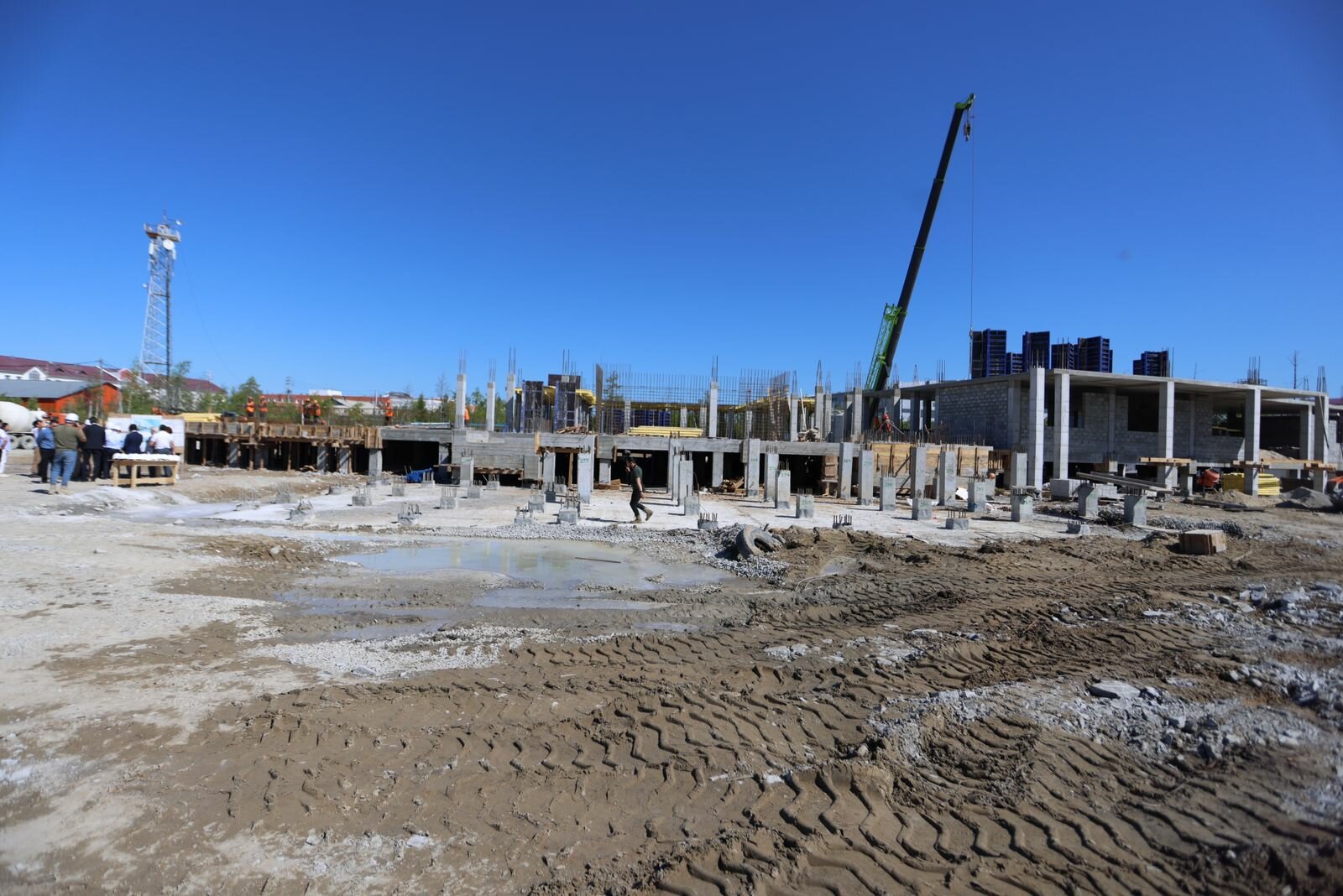 На сегодняшний день готов свайный фундамент, уложены плиты цокольного перекрытия. На данном этапе ведутся работы по бетонировании конструкции, кладке наружных стен, монтажу и установке насосной станции. Параллельно идут работы по вертикальной планировке благоустройства строительных территорий.