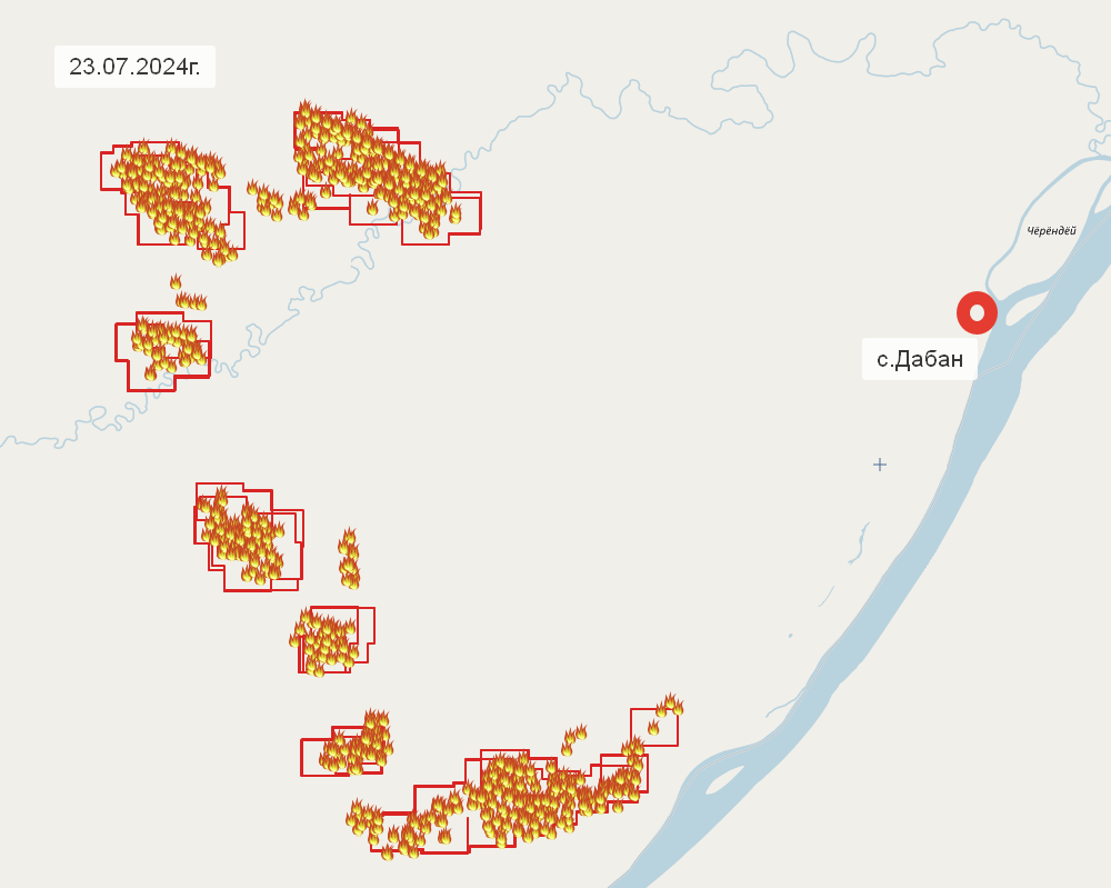 В 10 км от c. Дабан площадь пожара составляет 15 302 га. На тушении задействовано 95 человек и 14 единиц техники. Проложена мин.полоса протяжённостью 4,7 км. В 9,4 км от c. Куду-Кюель действует пожар площадью 3 680 га. На тушении задействовано 69 человек. Близ c. Тяня пожар действует на расстоянии на расстоянии 7,8 км, площадь — 2 551 га, на тушении задействовано 56 человек и 1 техника;